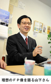 - 「開業6年目に入った今年、住宅購入やその他の相談も増加しました。相談内容は複雑多岐に渡ってきていますので、弁護士・税理士・司法書士などの専門家と連携し、ワンストップサービスを行うことによりお客様の満足度が向上していると思っています。ここにおられる今一さんと一緒に相続相談での問題解決を図り、お客様の不安を取り除くことができました。また、今年は結婚を契機に将来設計(住宅・教育・保険)の相談に来られた方が5組おられました。早い段階からライフプランを考えたいという意識の高まりは、良い傾向だと思っています。」